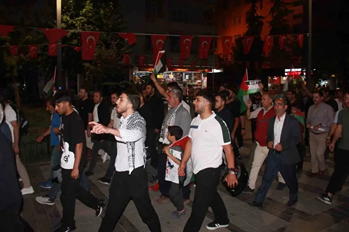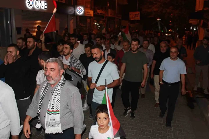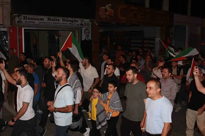 Gece yarısı 15 Temmuz Demokrasi Meydanı’nda bir araya gelen kalabalık, STK temsilcilerinin de katılımıyla Güres Caddesi boyunca yürüyüş yaptı. Ellerinde Filistin bayrakları taşıyan vatandaşlar, İsrail aleyhine sloganlar atarak Filistin halkına destek mesajları verdi.