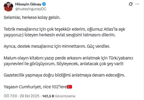Hüseyin Günay, bugün yaptığı açıklamada, olayın perde arkasını anlatacağını duyurdu. Günay, sosyal medya hesabından yaptığı paylaşımda, “Malum olayın kitabını yazıp perde arkasını anlatmak için Türk/yabancı yayınevleri ile görüşüyorum. Söyleyecek, anlatacak çok şey var!!!” dedi.